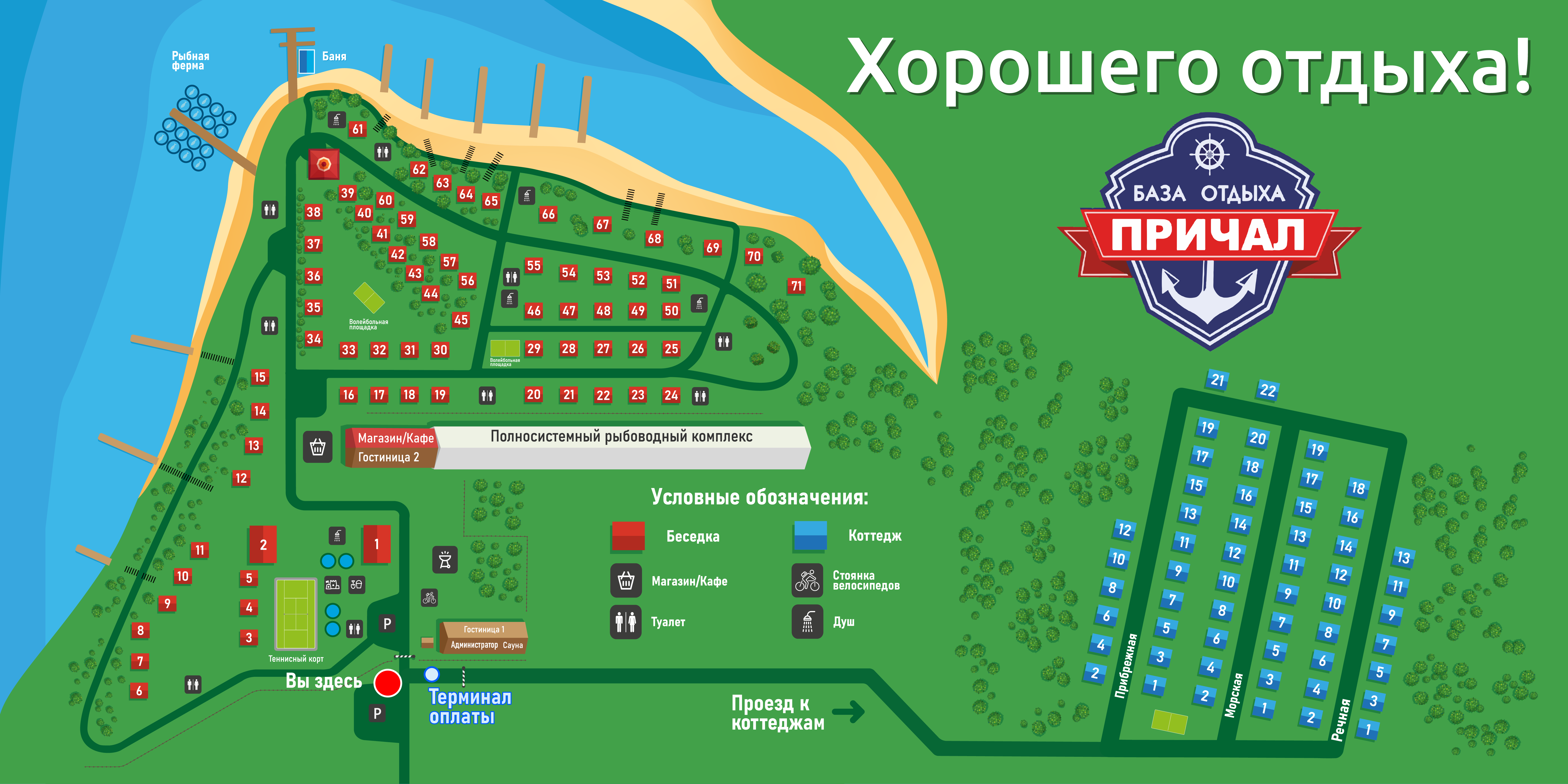 К Вашим услугам уютная гостиница, большие и малые беседки с мангалами, шатер для проведения праздников, корт для спортивных игр, кафе, магазин, просторный кемпинг, а так же стоянка и дозаправка для водного транспорта и даже вертолетная площадка!